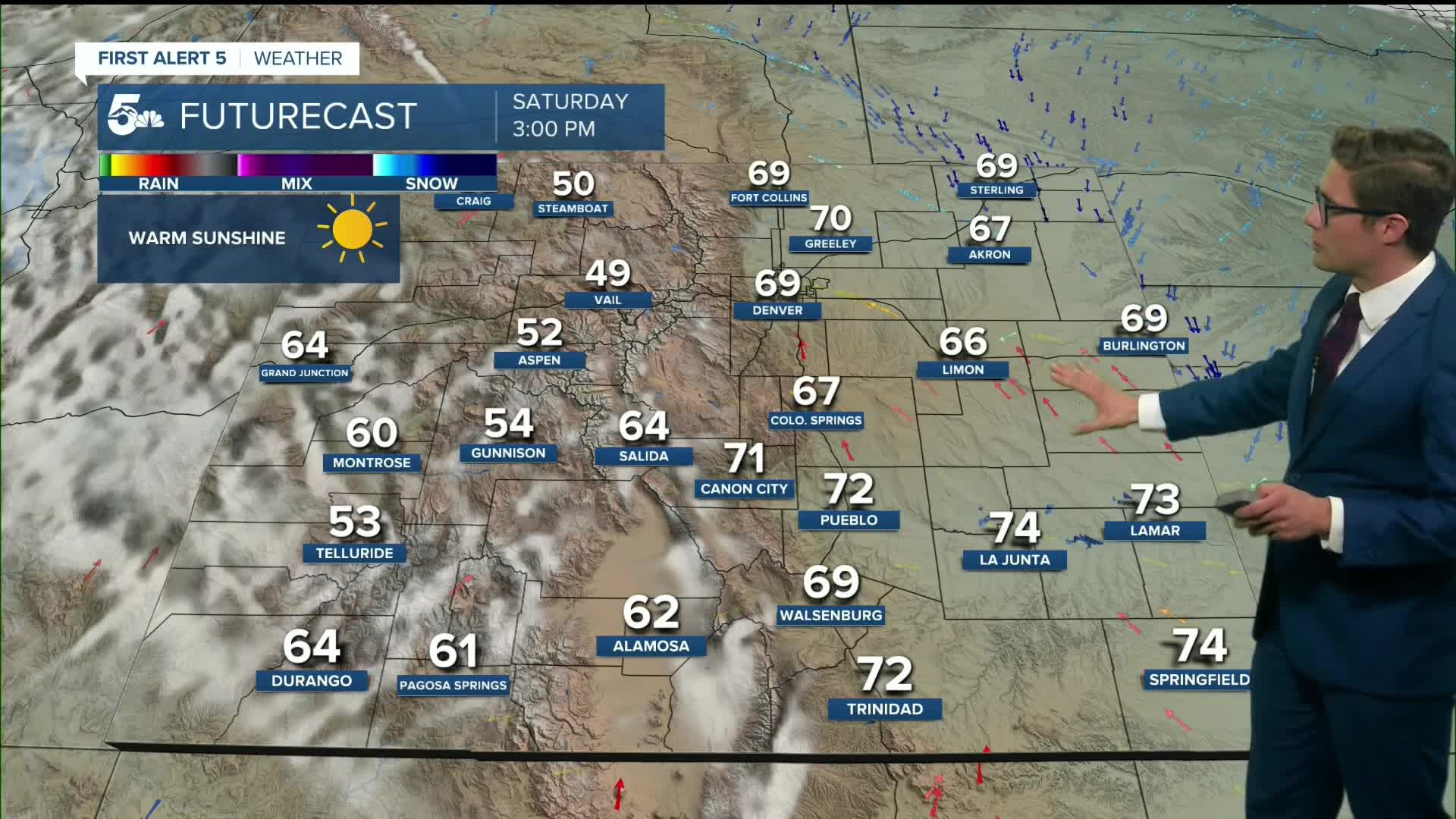 A weak backdoor cold front will push in tomorrow morning at the same time as an upper-level disturbance tracks generally into the northern half of the state. In Colorado Springs, this will lead to increasing clouds on Sunday and cooler highs in the lower 60s. A quick sprinkle is possible across northern El Paso county, into Teller County.