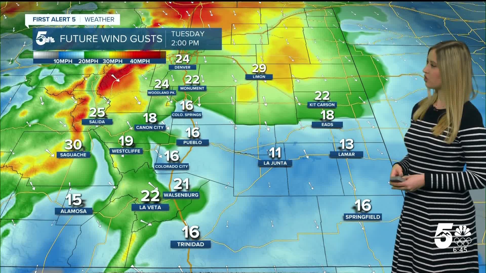 Tuesday will be partly cloudy with breezy winds in the afternoon. Wind will be out of the N at 10 mph gusting to 25 mph. The wind picks up as a cold front arrives. This cold front could bring snow flurries in the late afternoon or evening, with little to no accumulation expected.
