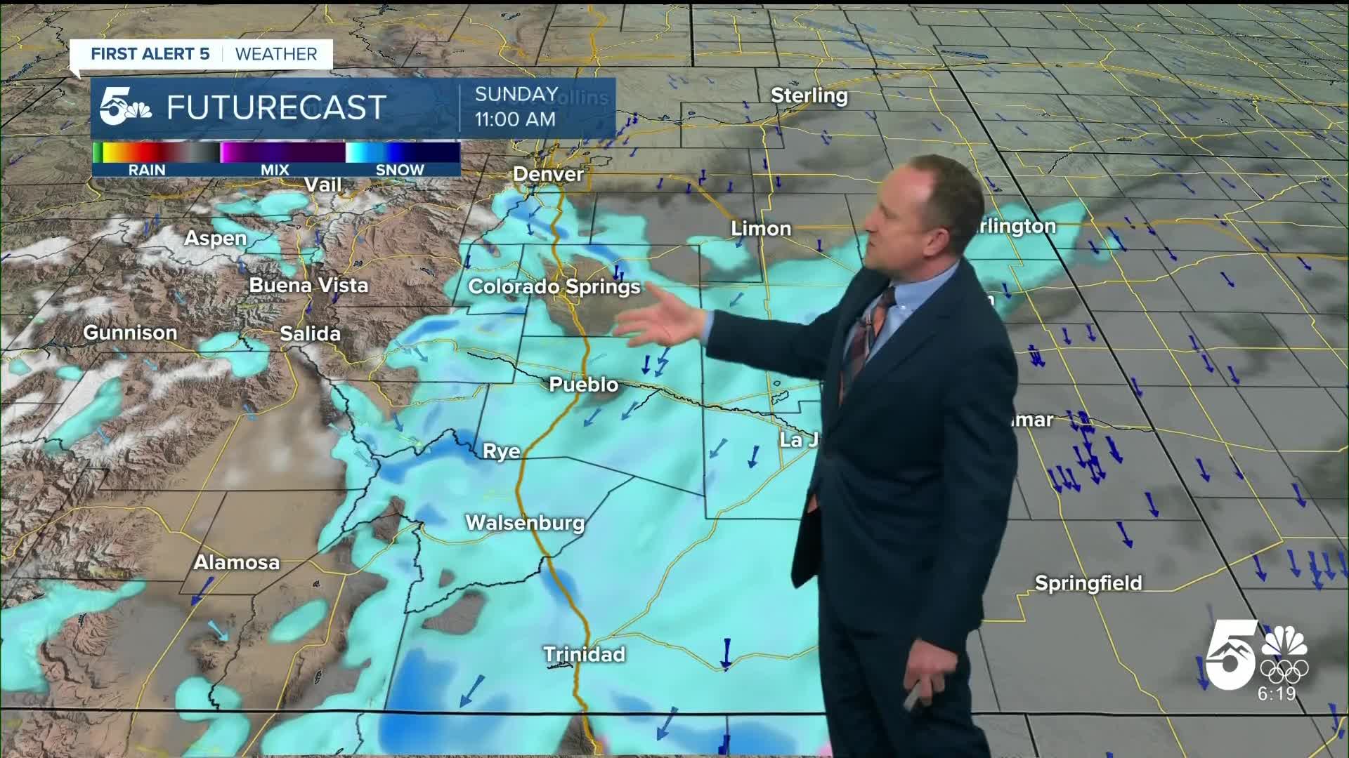 On Sunday, a strong cold front will arrive. This will bring us a quick burst of snow during the morning and early afternoon hours. It will also be windy and colder on Sunday, with strong northerly wind gusts to 40 mph, which could impact visibility at times during periods of heavy snow. Highs on Sunday will only warm into the 20s and 30s. Current snowfall projections are in the 1-2" range for Colorado Springs and Canon City, with 1-3" for Monument Hill. Isolated amounts to 4" will be possible for northern El Paso County and Teller County.