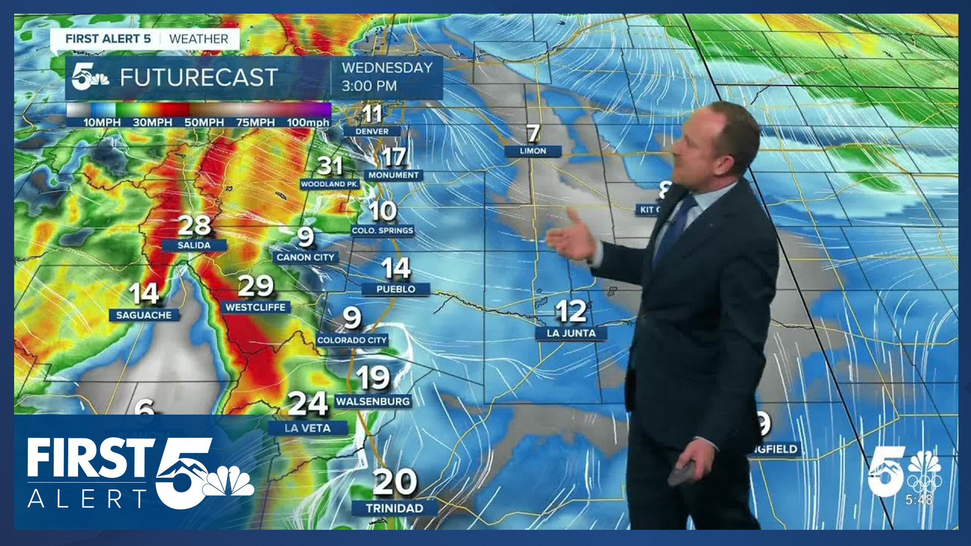 It will be mild today in Southern Colorado and skies will be mainly sunny. It will not be as warm as Tuesday - thanks to a cold front last night - but highs today will still make it into the middle 40s in the Pikes Peak Region. Red Flag Warnings are in place today for the western part of El Paso County, Teller County, Fremont County, and the upper reaches of the Arkansas River Valley. The warnings begin at 11 AM and continue until 6 PM. In these zones, downslope flow will return and winds will gust to 35 mph from late this morning to mid afternoon.