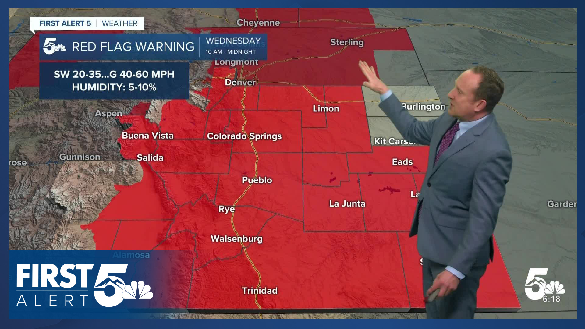 Extreme fire danger is ahead on Wednesday as strong upper-level winds arrive. Red Flag Warnings are in place and cover an expansive time frame from 10:00 AM Wednesday - 12:00 AM Thursday. This set up has the potential to be particularly dangerous - with humidity values down to the low single digits, sustained winds of 20-35 mph, and gusts to 60 mph in the afternoon. Skies will be partly cloudy early, and mostly sunny in the afternoon. Highs will again be in the 80s to lower 90s.
