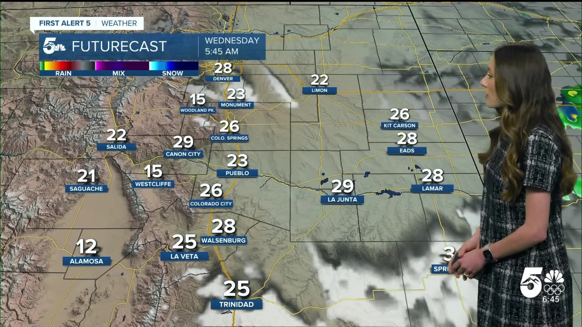 Woodland Park will be the coldest of the bunch. In the morning, lows will be in the teens. Even with some sun, it's not enough to overcome the colder air that settled in from this front. Highs will be in the upper 30s during the afternoon.