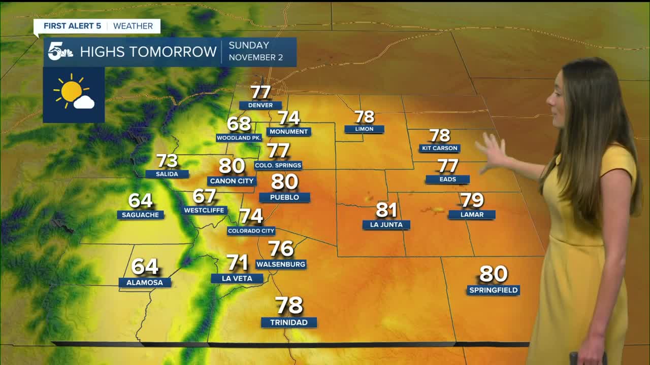 The southern I-25 corridor will have overnight lows in the upper 30s. Winds will be light throughout the day and afternoon highs will approach the upper 70s.
