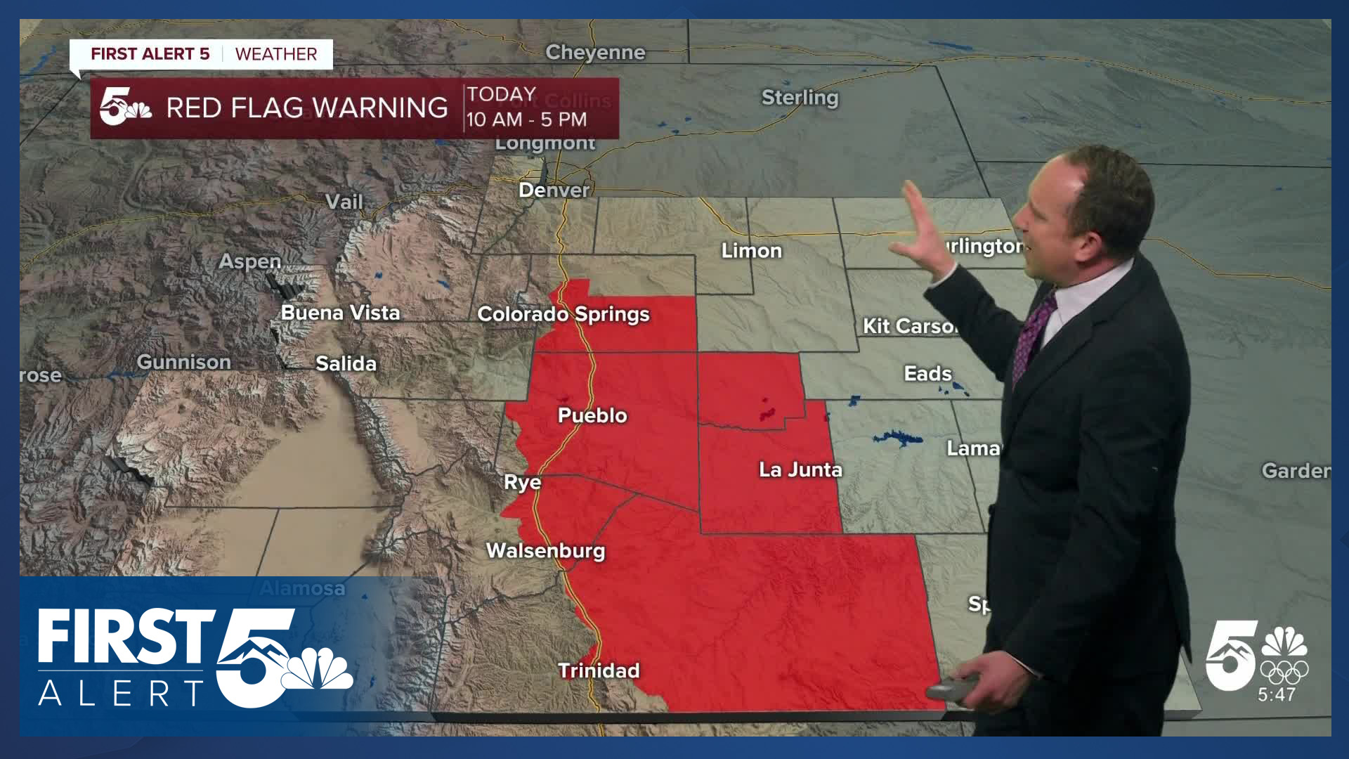 Walsenburg and Trinidad forecast: High: 50s/60s; Low: 20s/30s. Driven by strong downslope wind gusts to 50 mph, a Red Flag Warning will remain in effect today from 10 am until 5 pm.