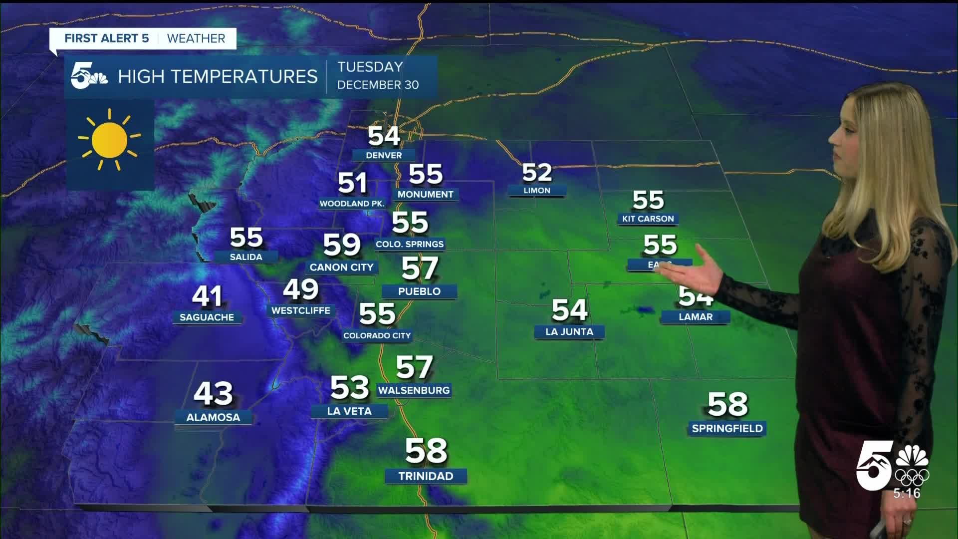 Highs will be in the low to mid-50s on Tuesday in the eastern plains. The sky will be sunny, and the wind will be light.