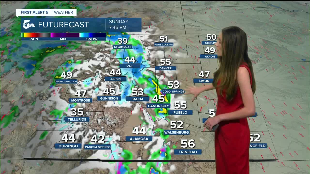 The day will start off clear and afternoon highs will still be warm. 60s and 70s along I-25 by the afternoon. Rain won't move in until the evening between 5-7PM. The southern I-24 corridor will likely steer clear of any rain.