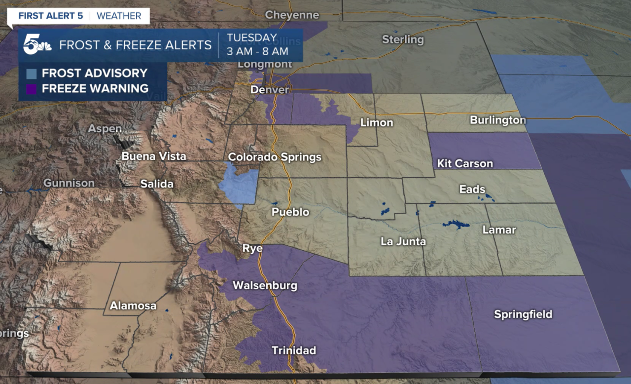 A frost advisory has been issued for eastern Fremont County and freeze warnings have been issued for Las Animas, Baca, Huerfano, and Cheyenne Counties from 3 am until 8 am Tuesday.
