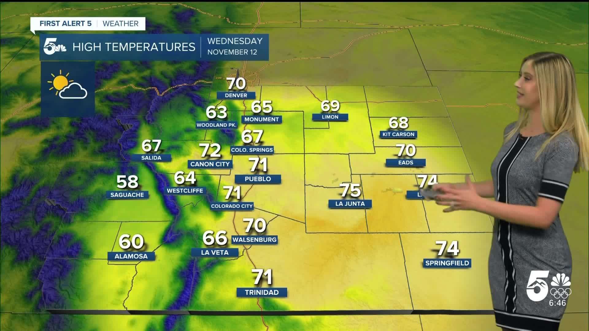 The storm we are watching for the weekend has slowed down a bit. Saturday is trending warmer in the 60s still. The cooler weather looks to arrive on Sunday when we drop to the 50s. Sunday also brings a chance of rain in Colorado Springs, with a slushy wintry mix possible in the evening. If a transition to snow were to happen Sunday night, accumulations would likely be light and only in the grass. Snow is expected in the mountains on Sunday, so prepare for winter driving conditions, especially in the high elevations.