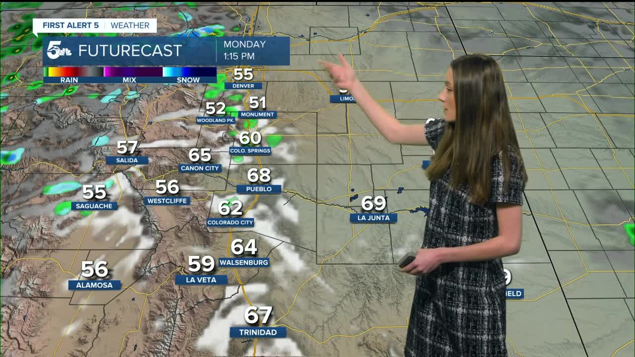 The southern I-25 corridor will dip into the 30s and 40s overnight and tomorrow morning. The chances for rain aren't as high this far south, and this area will likely stay dry. Afternoon temperatures will be in the mid-60s and lower-70s.