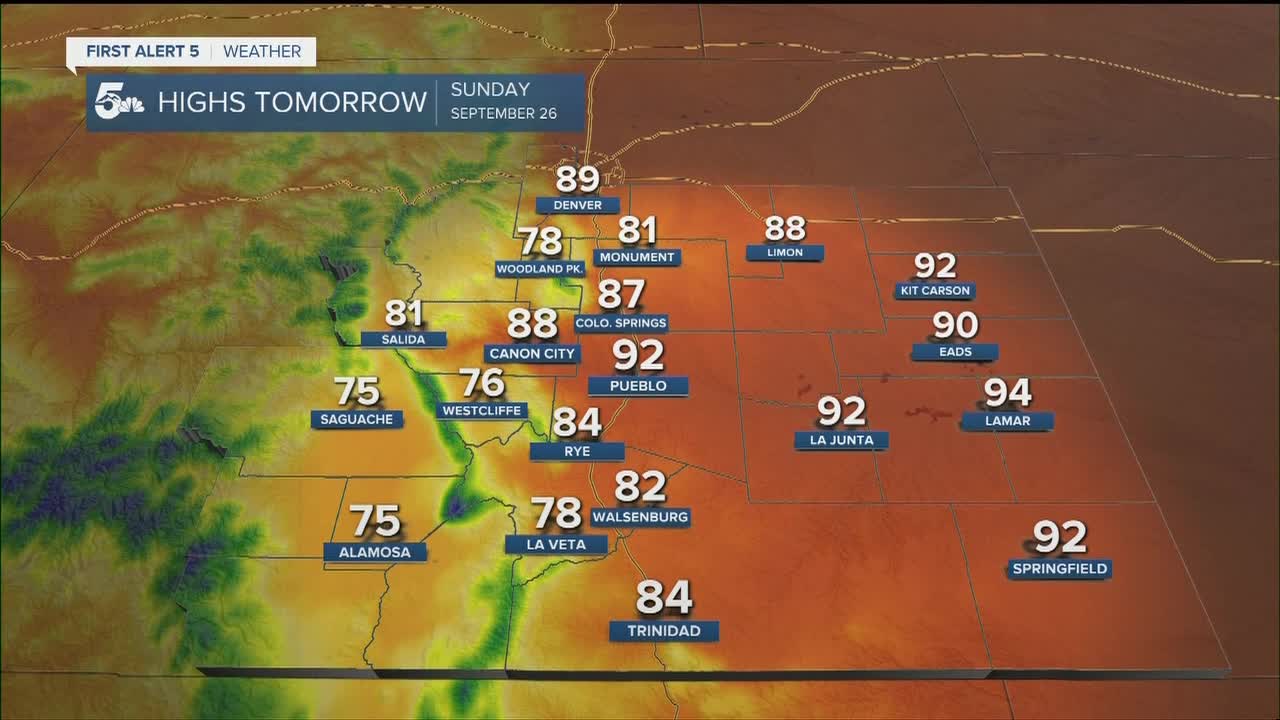 COLORADO SPRINGS: Low: 52; High: 87. Even hotter on Sunday, with increasing clouds during the afternoon and evening hours, but no real potential for any rainfall.