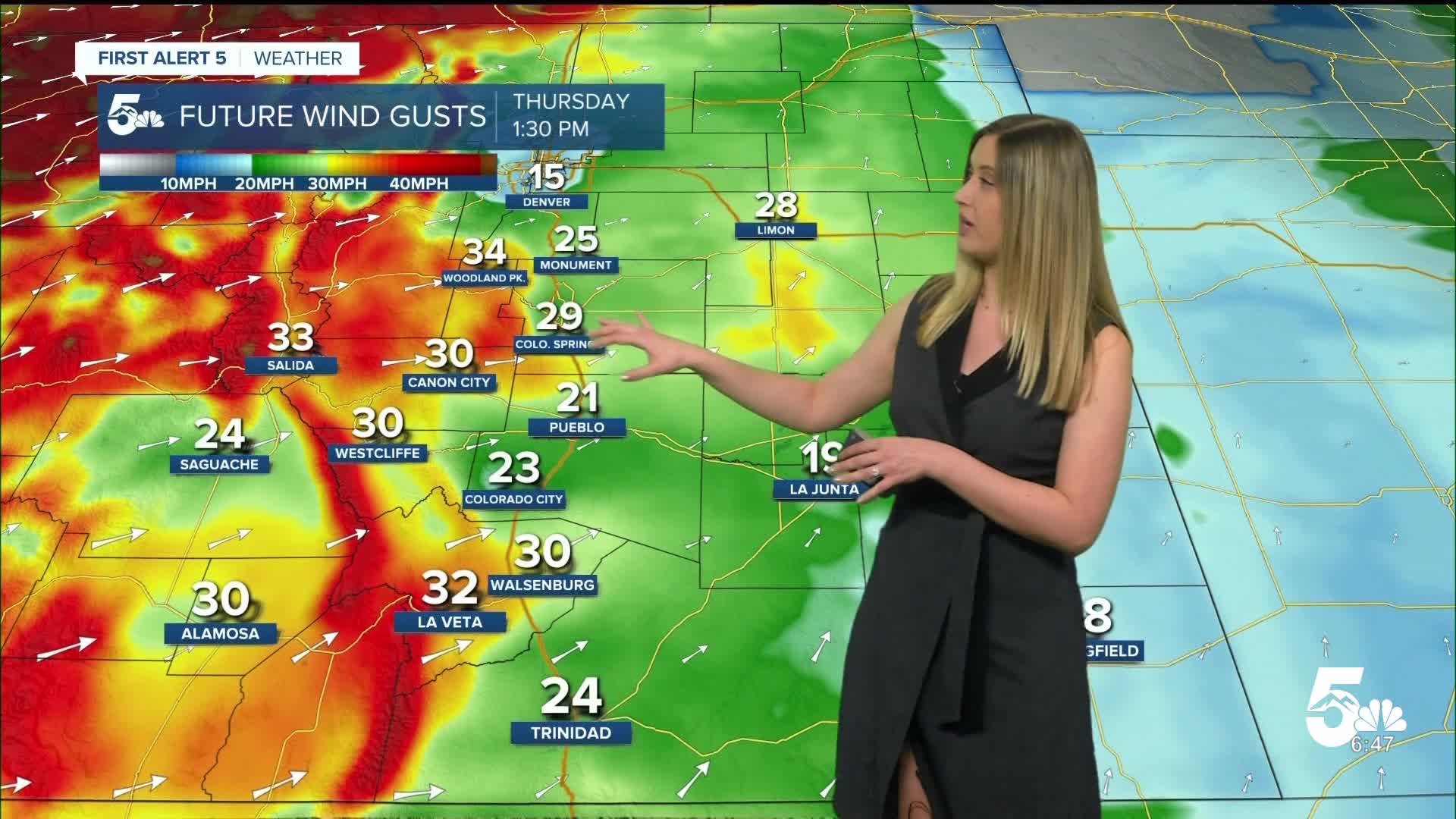 Back to sunshine and warm temperatures on Thursday. Winds will be strong out of the W at 15 mph gusting to 40 mph.