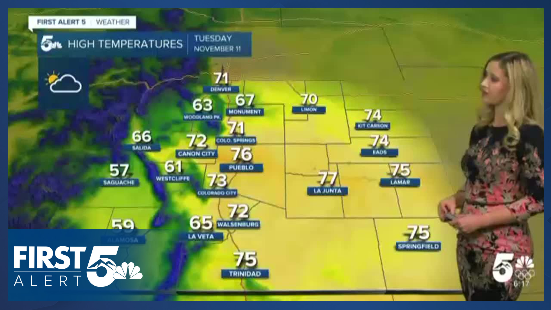 It will be a very warm Veterans Day in Colorado Springs. The forecast high of 71 will be close to the daily record high of 73, set in 1999. Winds will be breezy, especially in the morning, out of the WNW at 5-10 mph, gusting to 20 mph. There will be high clouds in place all day.