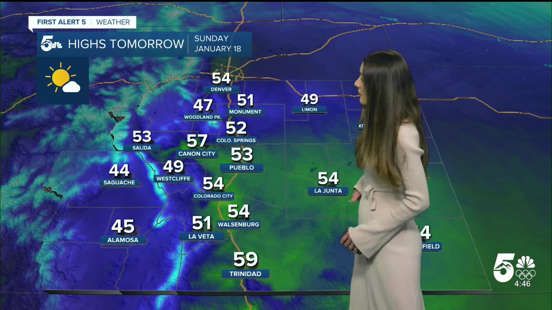 The southern I-25 corridor will have overnight temperatures in the 20s and teens. Highs tomorrow afternoon will be in the mid to upper 50s. Take advantage of the warmer weather because highs drop on Monday.