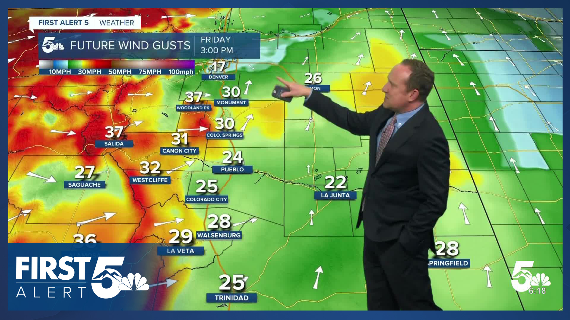 Red Flag Warnings will be in effect today from 11:00 AM - 9:00 PM. The wind won't be as gusty, strong, or widespread as you experienced early in the week, but it will still be gusty and dry today. Expect westerly wind for areas west of I-25, southwesterly to southerly east of I-25 and on the eastern Plains, with gusts at 30-40 mph this afternoon.