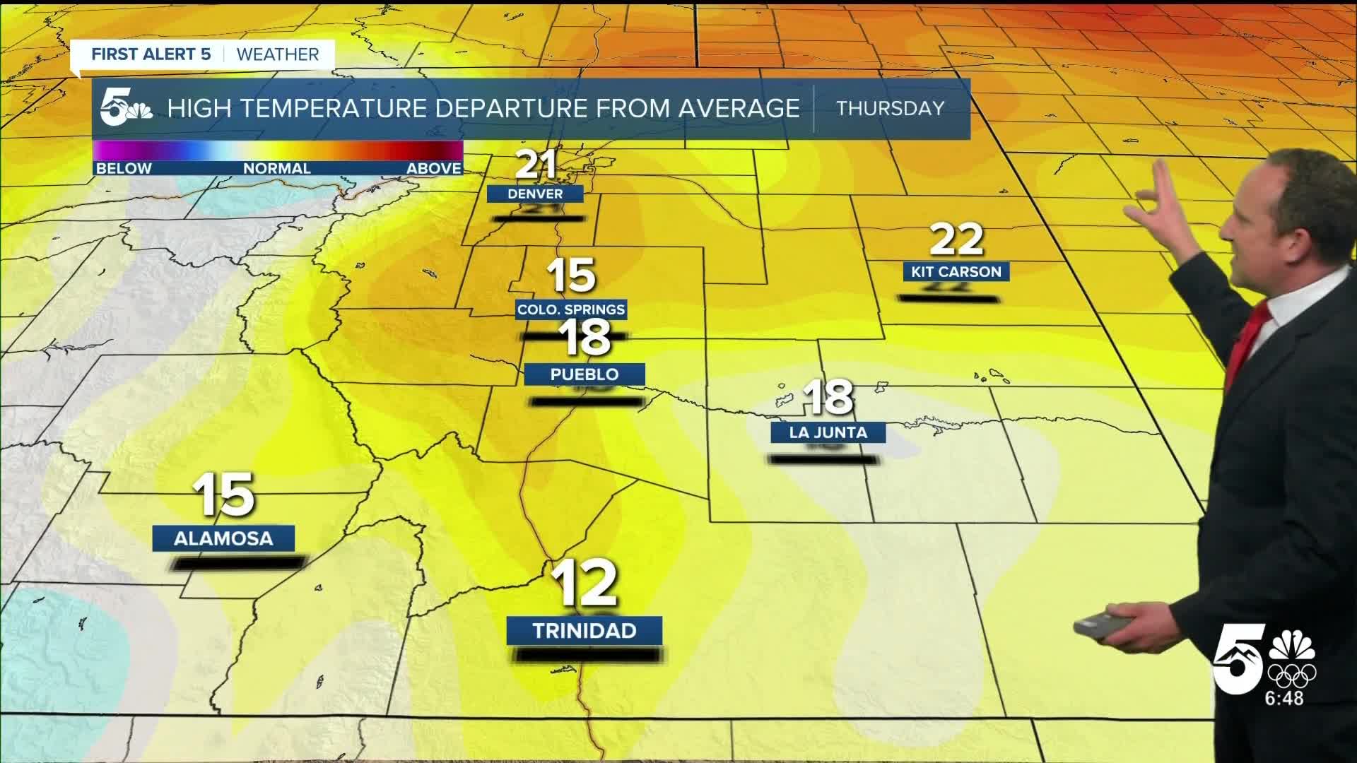 The big blue H continues to slowly shift east over the next several days and temperatures will remain well above average statewide as a result. In Colorado Springs and Pueblo, expect continued highs in the 60s. On Friday, winds will turn upslope in the afternoon out of the southeast.