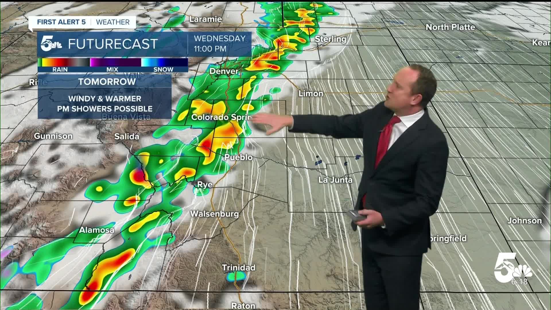 Wednesday will be warm and windy, with peak gusts as high as 30-45 mph. The southwest flow will help to keep us dry while also leading to a warm afternoon in the middle to upper 70s in Colorado Springs, with lower to middle 80s in Canon City and Pueblo. A line of showers moving out of the mountains late Wednesday could bring rain and thunderstorms to the I-25 corridor and and eastern Plains late Wednesday and Thursday.