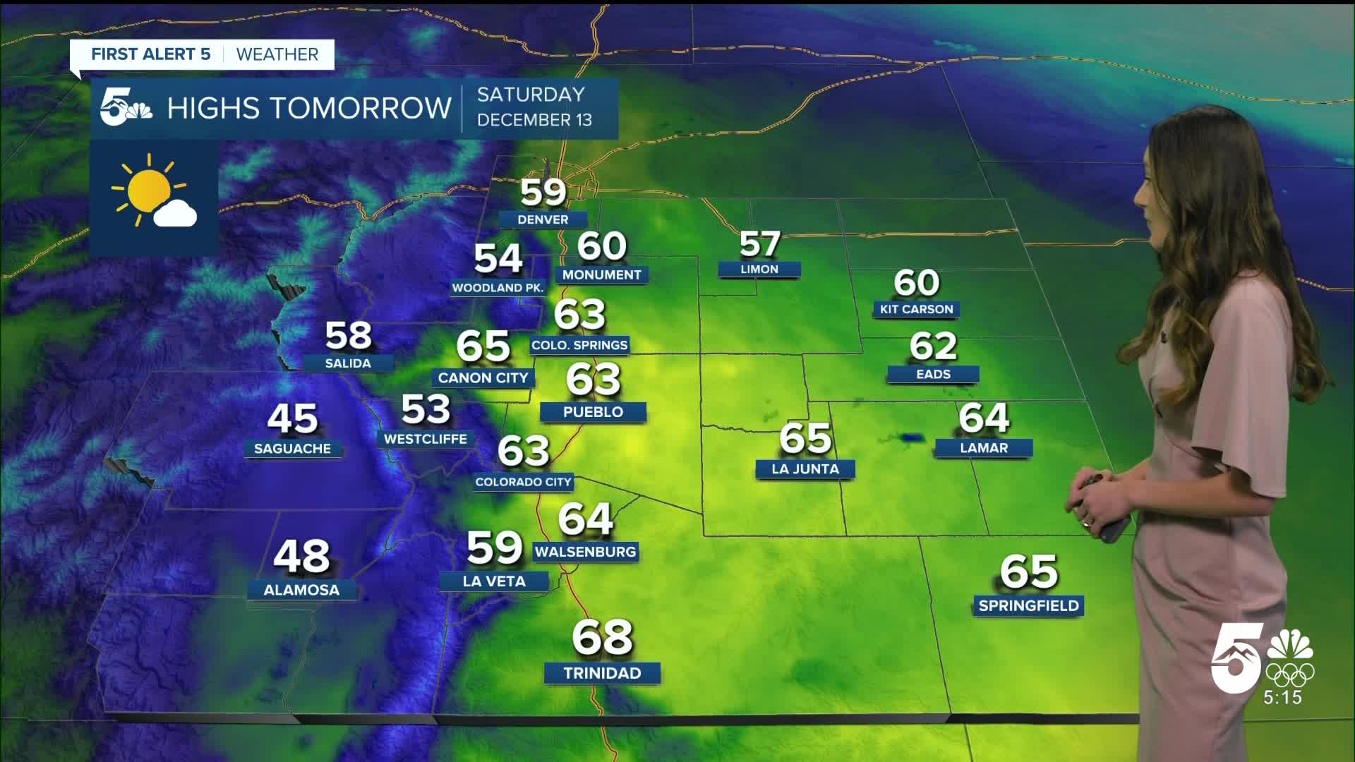 Chilly temperatures arrive overnight and will stay through the early morning hours on Saturday. Afternoon highs will rise into the 60s. Pueblo won't have as many clouds tomorrow.