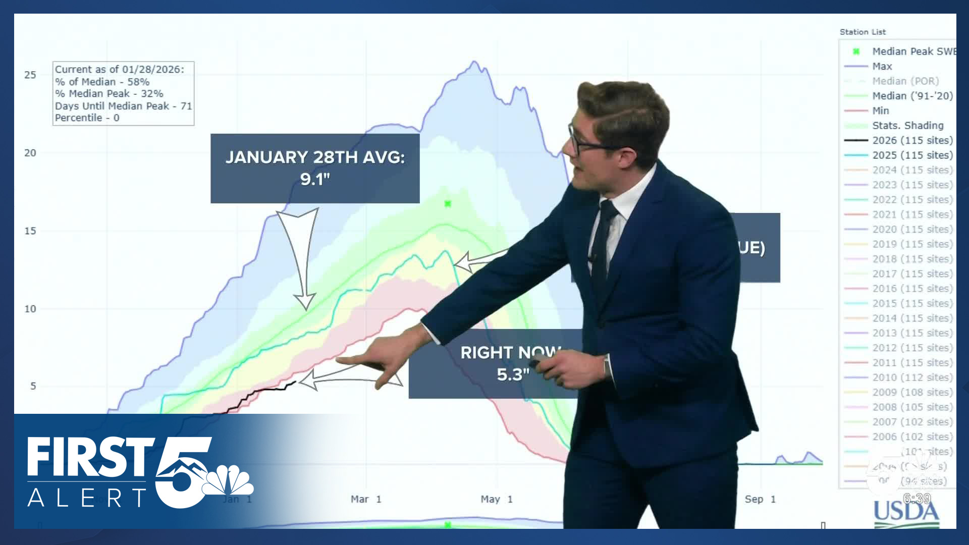 The weekend winter storm did slightly raise the snowpack percentages. Last week snowpack was at 57% of median statewide, and today the state is at 58% of median.