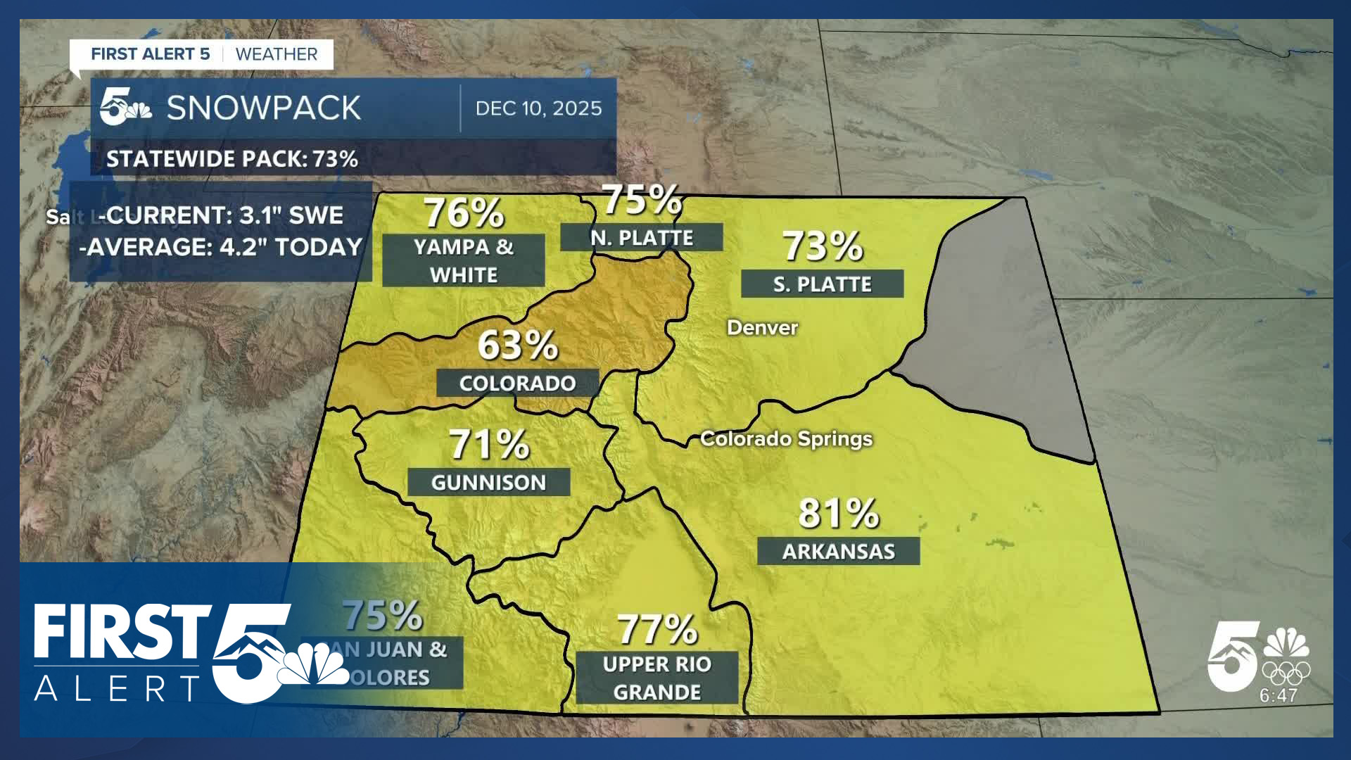 COLORADO (KOAA) — Colorado's snowpack has improved over the past week, jumping from 58% of average on December 5th to 73% of average today, largely due to significant snowfall over the weekend.