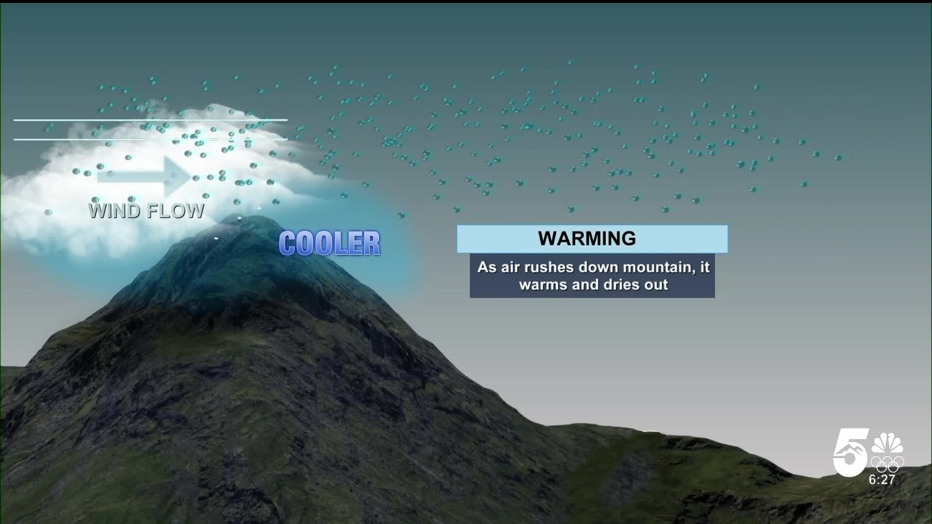 Downsloping westerly winds were the reason for the strong gusts. As the jetstream moves overhead, some of that energy is mixed down closer to the surface. These winds then race down the other side of the mountains and will heat up due to compression.