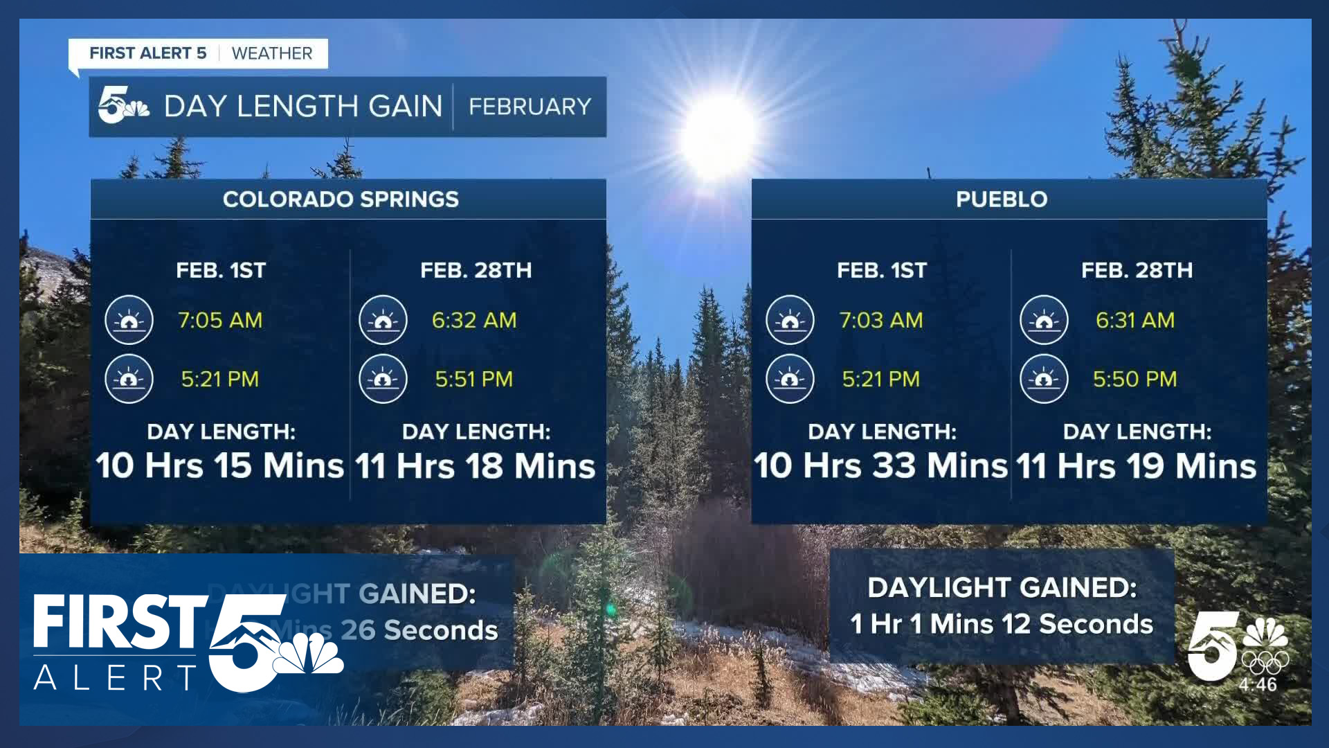 Colorado Springs will gain more than an hour of daylight in February. We're now gaining over two minutes of light every day.