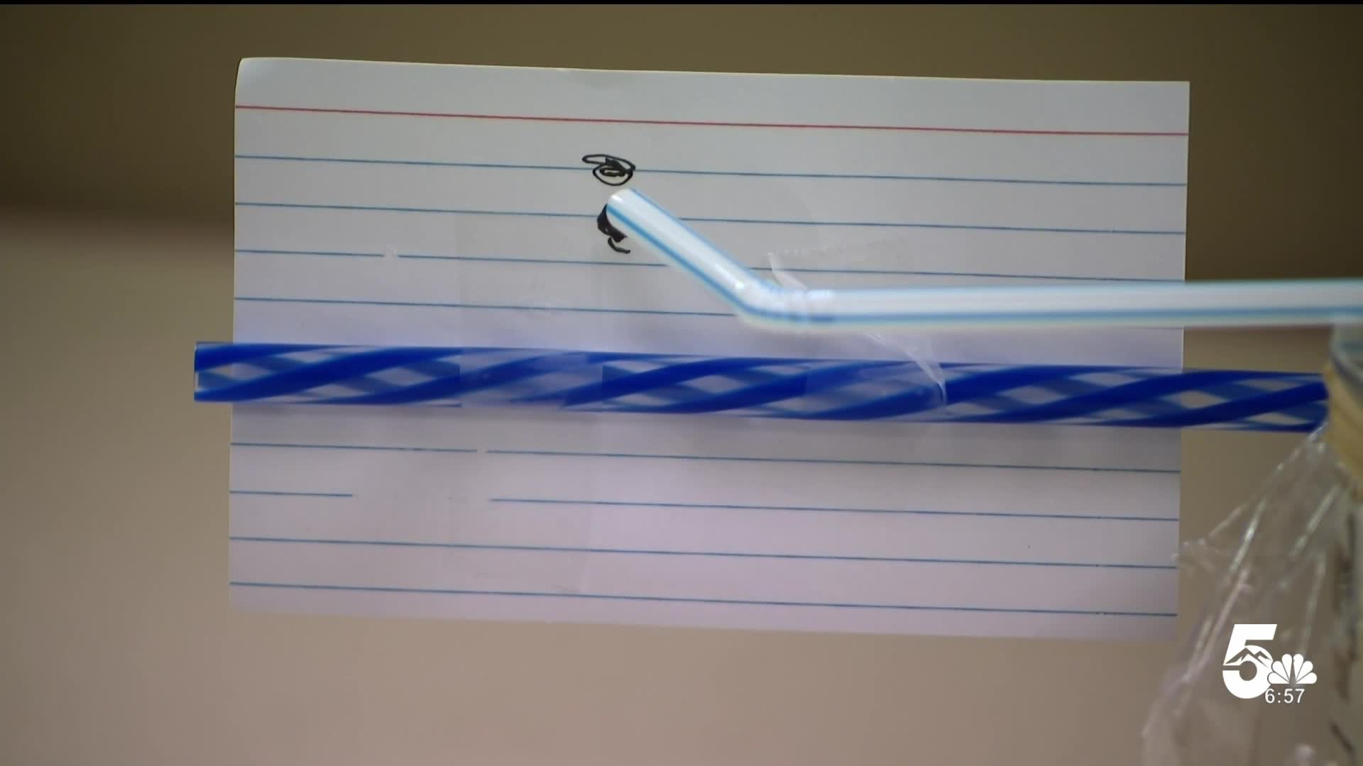 Now, grab an index card and a straight straw and tape them together and attach the whole thing to the can. Then, mark the spot where the straw is right now with a marker.