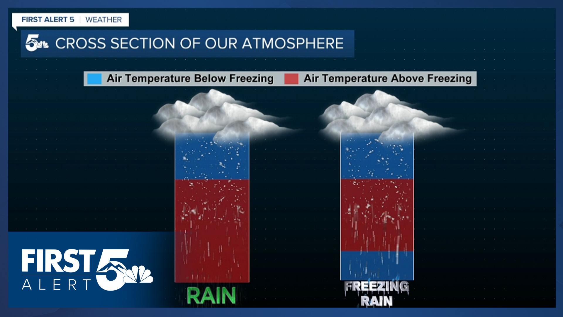 In Colorado, we don't have that warm layer of air that would allow for icy conditions. Instead, we will have a full column of air that will have below freezing temperatures, and allow for snow.