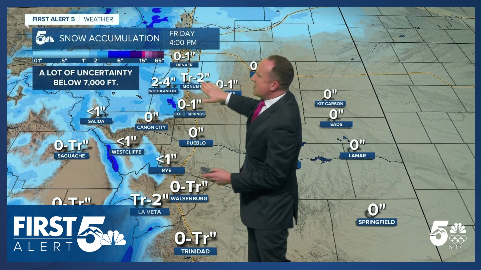Our well-advertised storm system will arrive Thursday. Rain chances increase through the day - with low chances in the morning, moderate chances by afternoon, and widespread rain by the evening. We'll see morning showers Thursday on the southeastern plains, and scattered snow showers in the morning in the mountains. The snow level with this system stays relatively high due to a lack of cold air - around 7,000-8,000 feet. That line may briefly dip down closer to 6,000-6,500 feet early Friday morning. Showers continue overnight into Friday morning. Travel impacts are likely for the Friday morning commute over the Palmer Divide, and in Teller County, where precipitation will change over to snow.