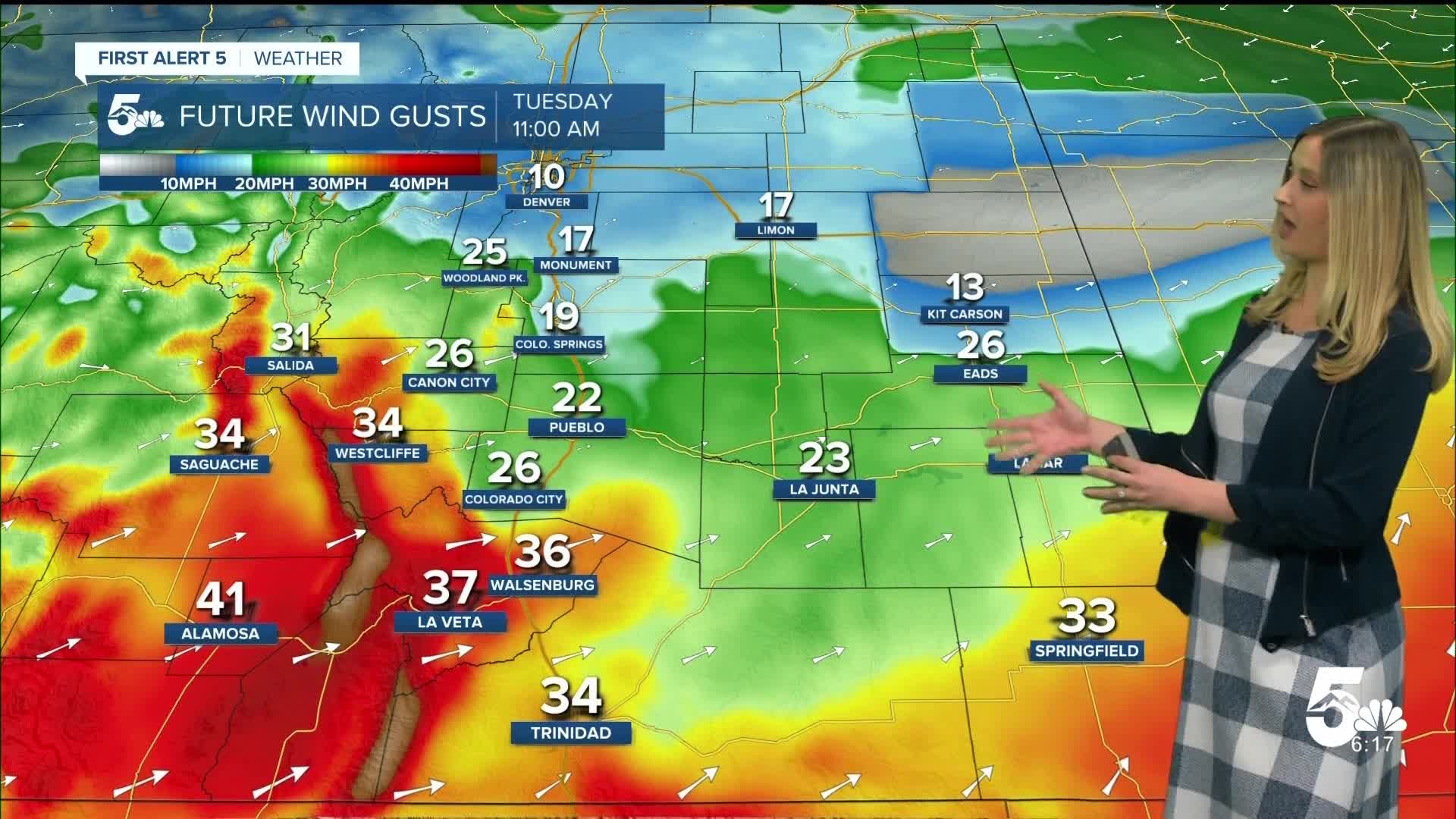 While it will be snowing in the high country on Tuesday, our region will experience downsloping wind that will dry out the air. RED FLAG WARNINGS will be in effect from 11 am until 8 pm on Tuesday for the zones in red. Humidity will drop as low as 9%, and winds will gust up to 45 mph.