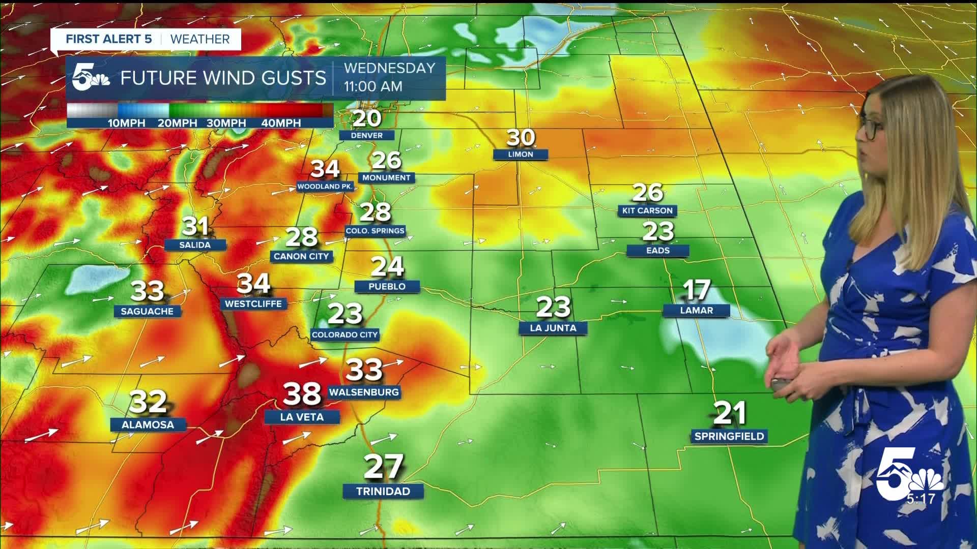 Thursday brings high fire danger once again, but wind gusts will be lower, maxing out in the 40 mph range, and temperatures will be about 10-15 degrees cooler.