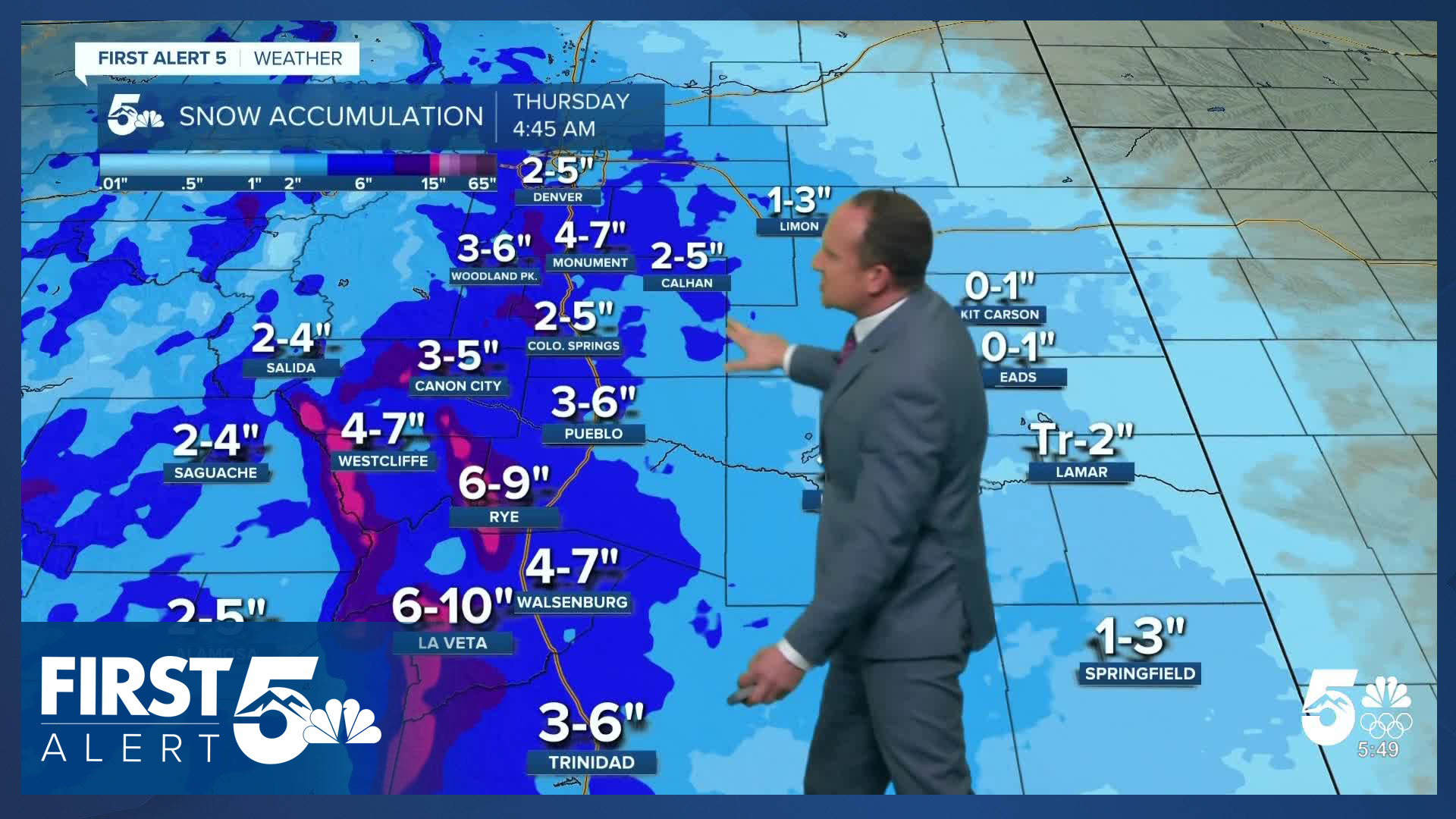 Snow will begin from north to south on Wednesday morning before sunrise, and is likely to be band-like, with accumulating snow in narrow corridors, and flurries in between those bands. Steadier snow will begin as the main western low gets closer, which provides extra lift to the atmosphere. It will snow throughout Wednesday, with intensity alternating through time as bits of energy flow over the mountains and the wind speeds adjust and slightly shift direction through the day. A widespread 2-5" is our current forecast for Colorado Springs, with isolated higher totals where those narrow bands of heavier precipitation set up. Higher totals are also likely over the Palmer Divide - with 4-7" likely, and again, the potential for more in some localized parts of the area.