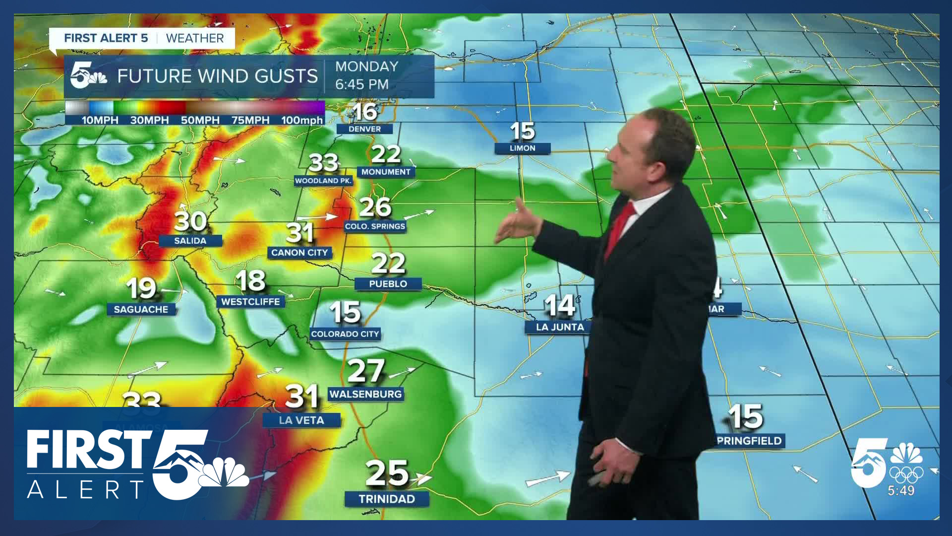 Mountains forecast: High: 40s/50s; Low: 20s/30s. After snow last week, spring-like wind and warmth will return to the Wet Mountains and Sangres on Monday. Peak gusts this afternoon could top 45-50 mph in some areas.