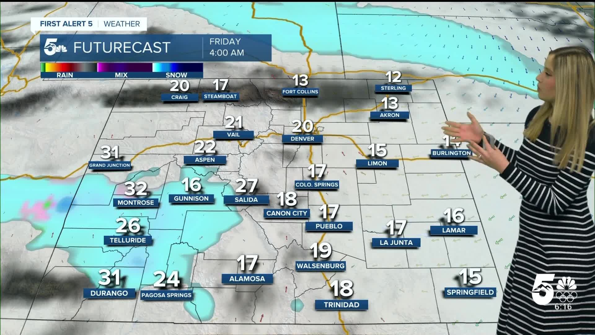 The weather takes a drastic turn on Friday and Saturday, where high temperatures plummet to the 20s. Snow showers will be possible as well on Friday and Saturday. Accumulations in Colorado Springs are looking on the order of a couple of inches. But the temperatures will be frigid, with overnight lows in the single digits through the weekend.